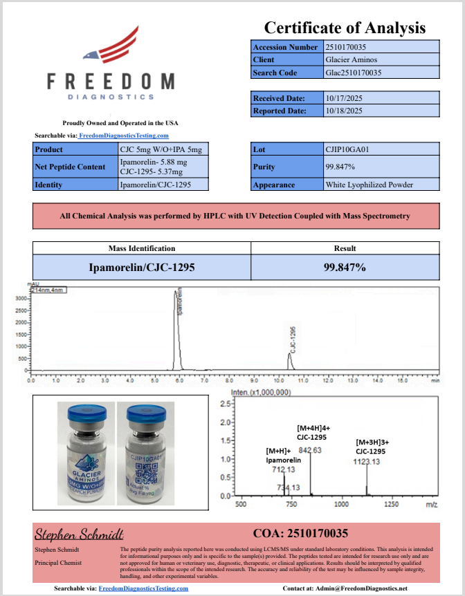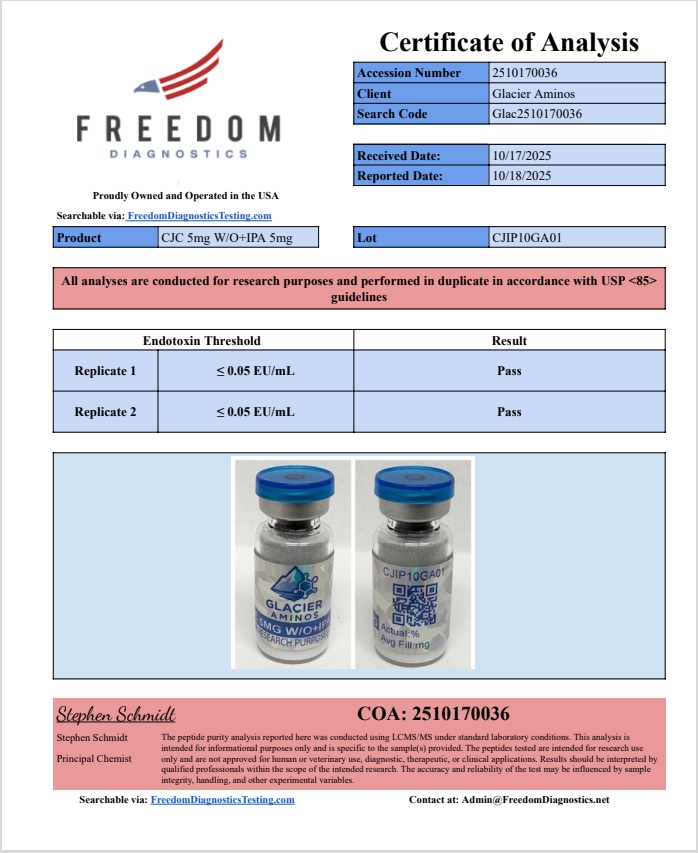 All information is for educational purposes only. Glacier Aminos makes no claims regarding efficacy or safety. Purchasers are responsible for ensuring proper handling and use in compliance with all applicable laws and regulations.