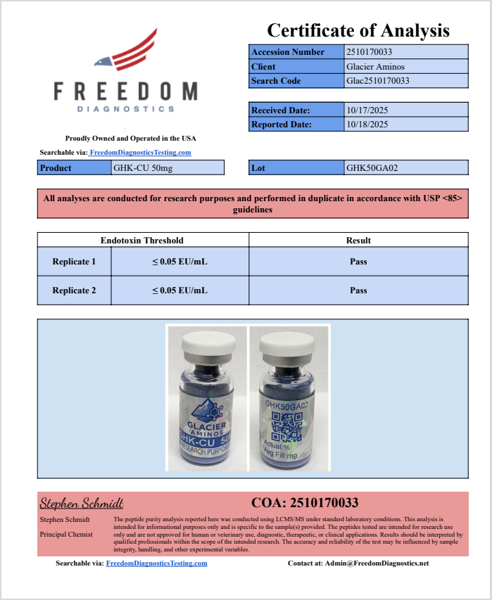 All information is for educational purposes only. Glacier Aminos makes no claims regarding efficacy or safety. Purchasers are responsible for ensuring proper handling and use in compliance with all applicable laws and regulations.